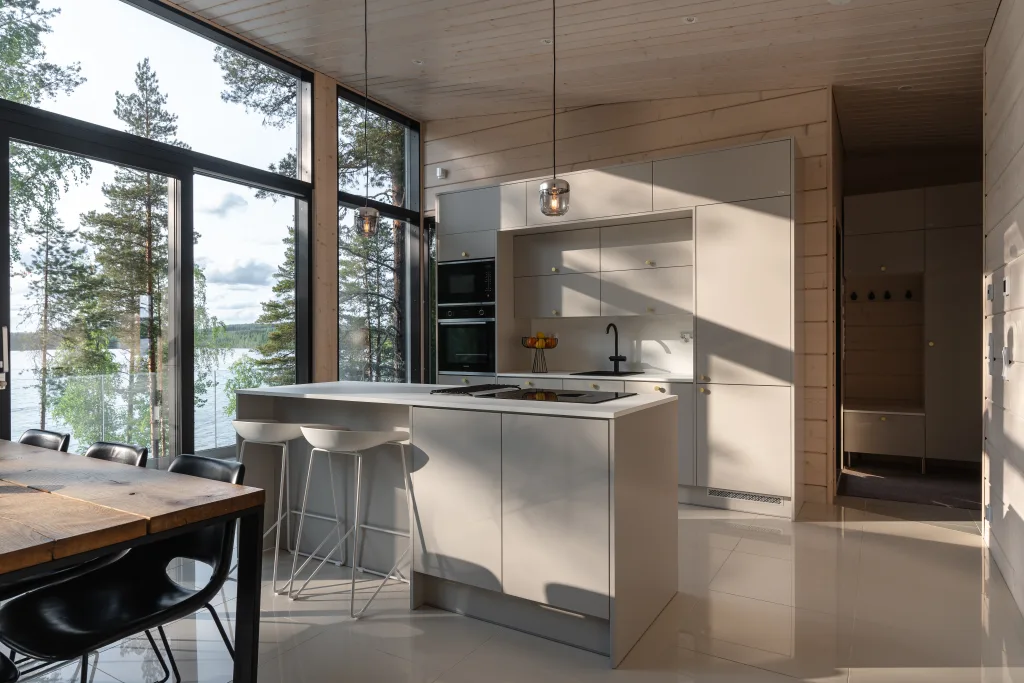 Kodin sielu on keittiön ja olohuoneen muodostama iso tila, jossa lattiasta kattoon ulottuva ikkunaseinä kehystää järvimaiseman. “Näkymä on jokapäiväinen ilonaihe. Ikkunat tuovat maiseman niin lähelle, että vuodenajat tuntuvat sisällä asti.”