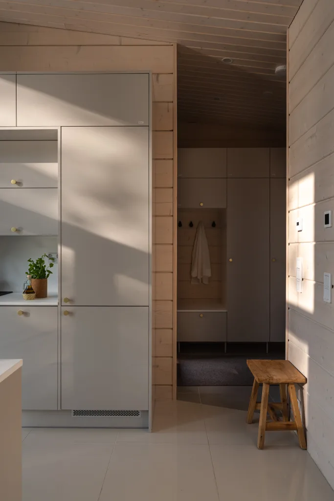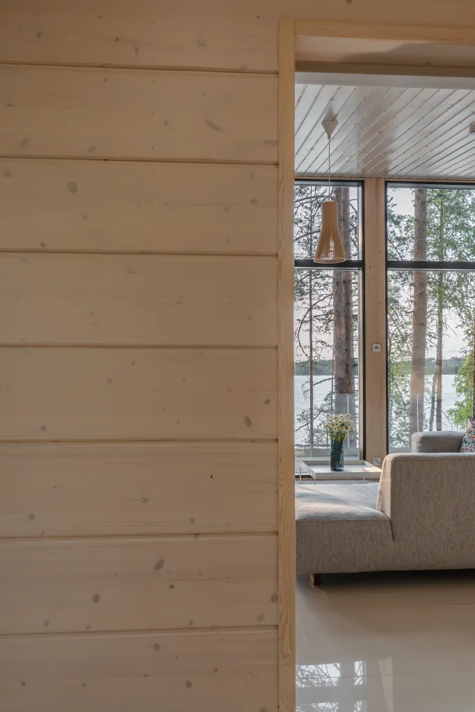 Talon tumma julkisivu ankkuroituu rinnetonttiin ja puustoon, ja sävy kehystää ikkunapinnat ja antaa arkkitehtuurille rauhallisen rytmin. Sisällä tunnelma vaihtuu vaaleaan, luonnonvaloa heijastavaan hirteen. Vaaleaksi käsitelty hirsi jatkaa yhtenäistä ilmettä huoneesta toiseen, ja luonnonvalo pyyhkii pehmeästi seinäpintoja pitkin. Toive “hirrestä, joka ei halkeile” ohjasi suunnittelua, ja näin materiaaliksi valittiin painumaton hirsi. “Painumaton hirsi on myös kestävä ja mittatarkka. Varsin tekninen päätös, jonka vaikutus kuitenkin tuntuu joka huoneessa, sillä lopputulos on hyvin viimeistelty ja harmoninen.” asiakas kuvailee.
