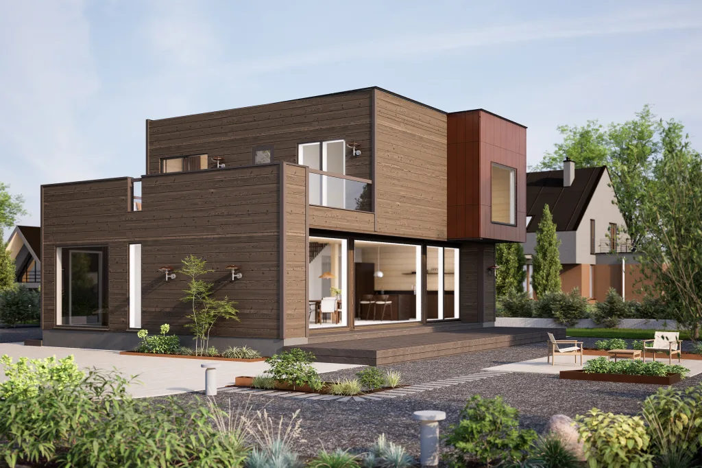 Geometriset muodot ja jyrkät kulmat luovat talolle voimakkaan ilmeen, jossa yksinkertaisuus kohtaa näyttävyyden. Tämä rohkea muotokieli ei pelkästään määrittele talon ulkonäköä, vaan luo visuaalisen yhteyden kaupunkitilan ja luonnon välille, tehden talosta yhtä aikaa urbaanin citykodin että maisemaan sulautuvan modernin piilopirtin.